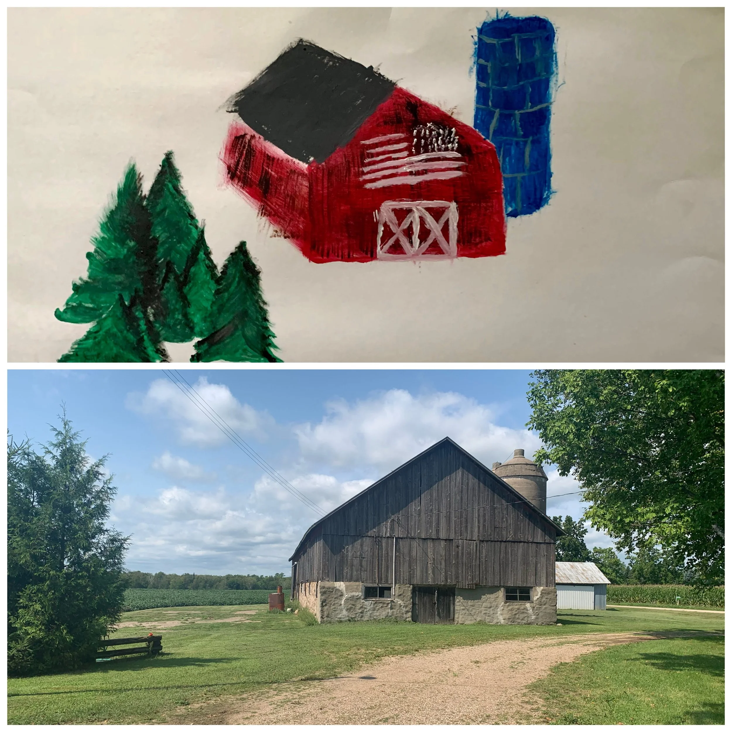 The picture on the top is a painting of a barn, silo, and pine trees-done by my boyfriend December of 2020.