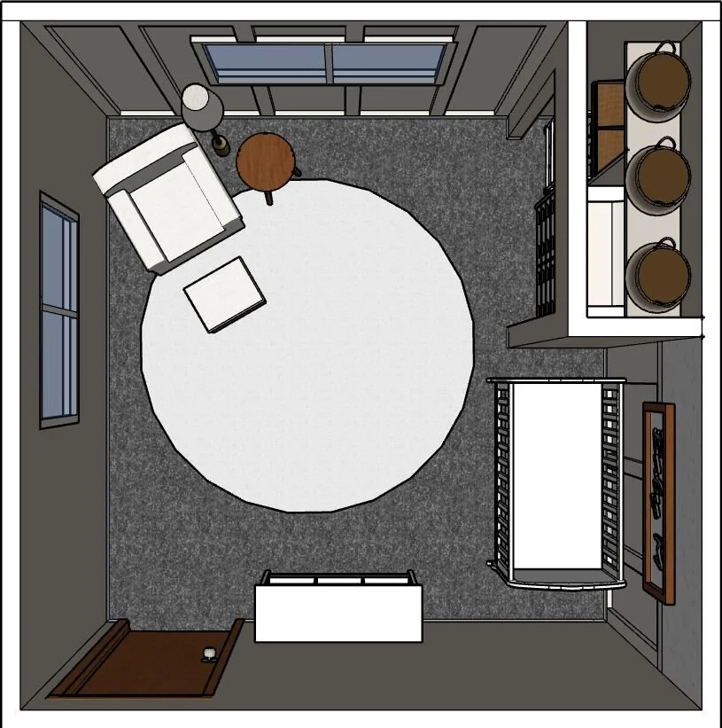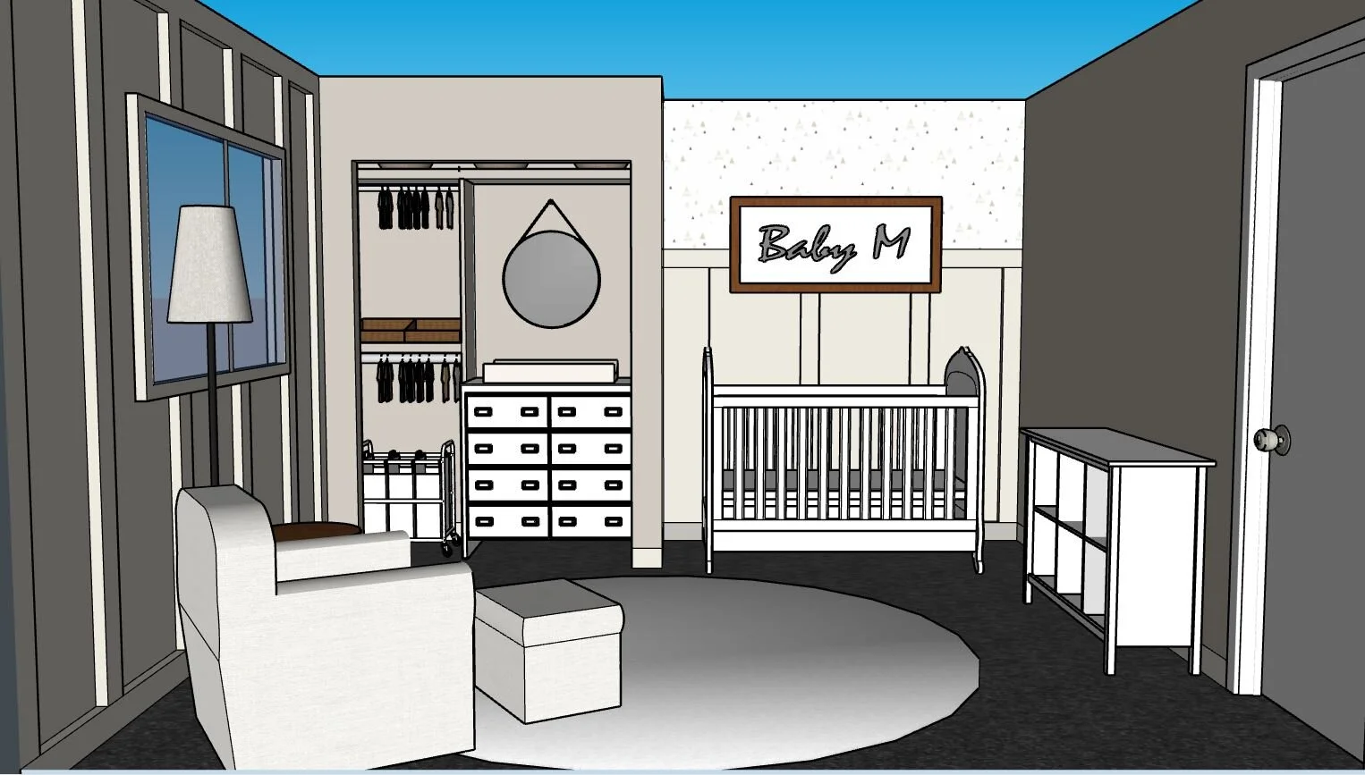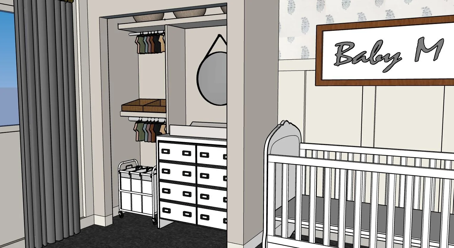 This nursery design is one of my favorites. The neutral color palette brings so much softness and comfort into the space. The crib sits on a wall that features half board and batten paired with a paisley-print wallpaper on top. I wanted to make sure the design was not only appealing, but also functional. We decided to makeover the closet space to accommodate a changing table, diaper bins, laundry baskets, plenty of basket storage, and clothing racks. This will help keep clutter to a minimum and tucked away while keeping essential items neatly organized.
